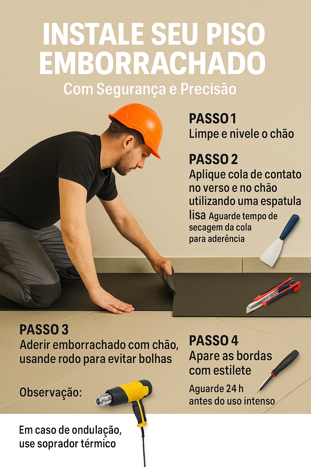 piso ao longo do tempo. Aplique a cola diretamente na área de colagem, utilizando uma espátula ou rolo, conforme necessário. Após a aplicação, retire o excesso de cola imediatamente com um pano úmido para evitar manchas ou danos à superfície do piso. Seguindo essas orientações, você garantirá uma instalação bem-sucedida. Para um resultado ainda mais preciso e seguro, recomendamos contar com a ajuda de um profissional especializado.